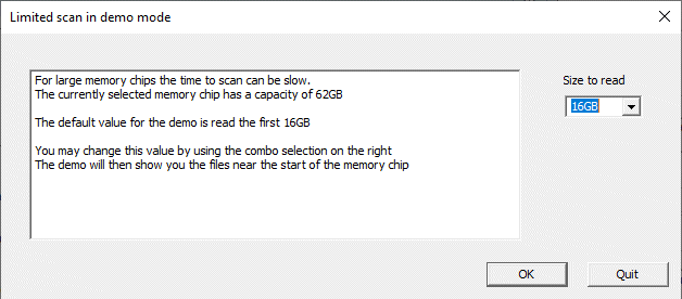 Doing a full scan of a memory chip can be slow - and not necessary to prove the program works in the demo. For this reason, the default scan size with the demo proogram is 16GB. This should produce very approx 30 minutes of video to prove that the program works. This default value may be changed as for instance GoPro Hero 11 camera write files upto 11GB in size
